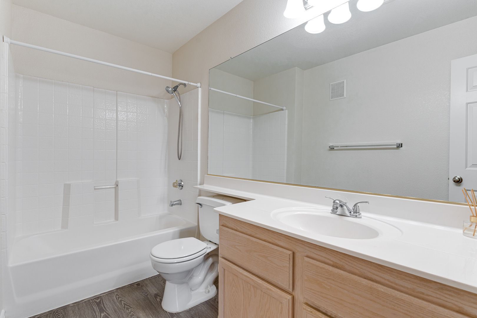 A decorative fireplace adds a touch of charm, while the primary bedroom offers added privacy with double sinks and a tub/shower combo. One small pet will be considered.