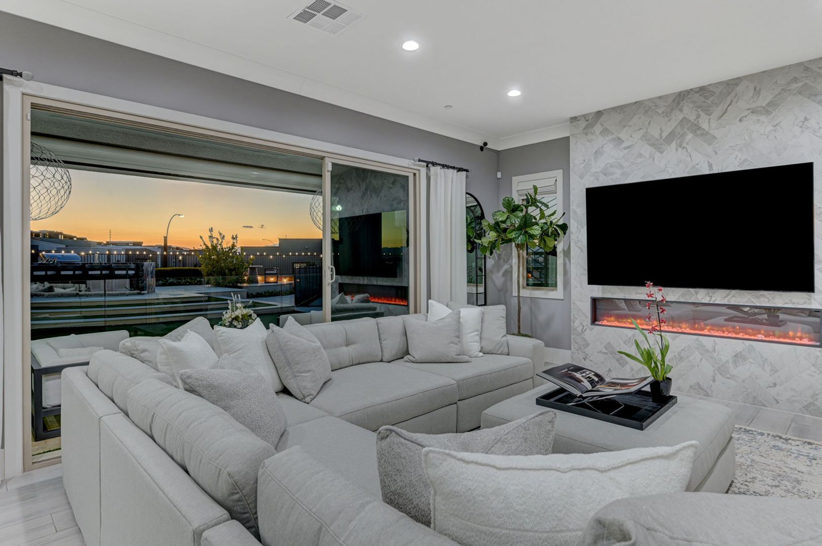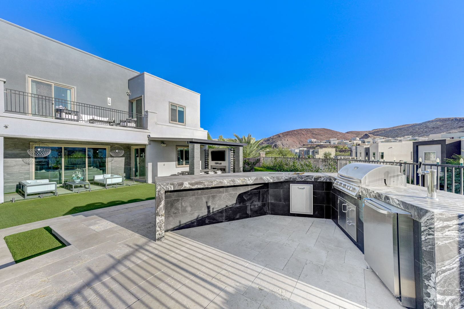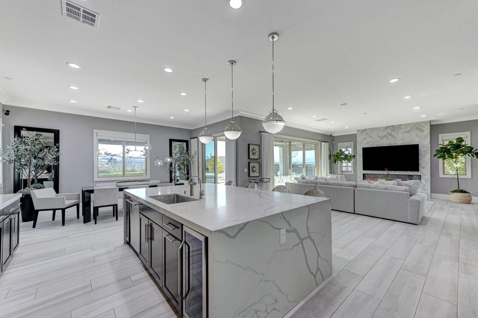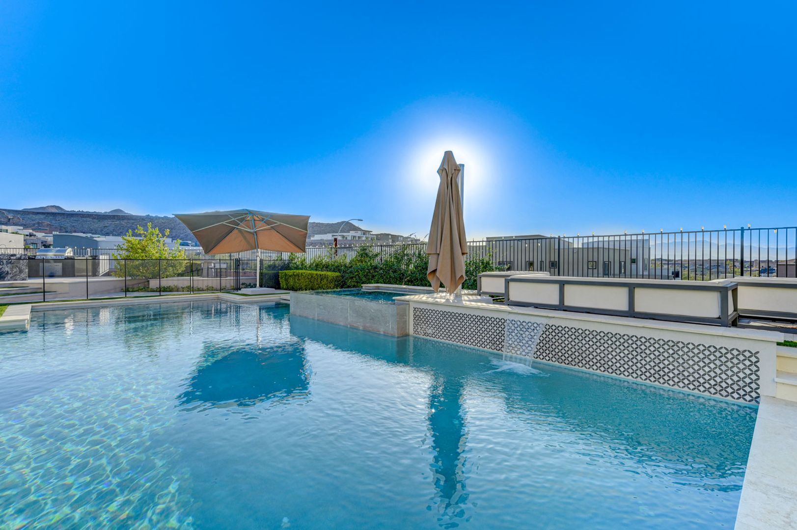 Set on the community’s largest lot, the backyard delivers true resort living with unobstructed views, a 40+ foot pool, jacuzzi, firepit, and an outdoor kitchen with dining area, TV, and shower.