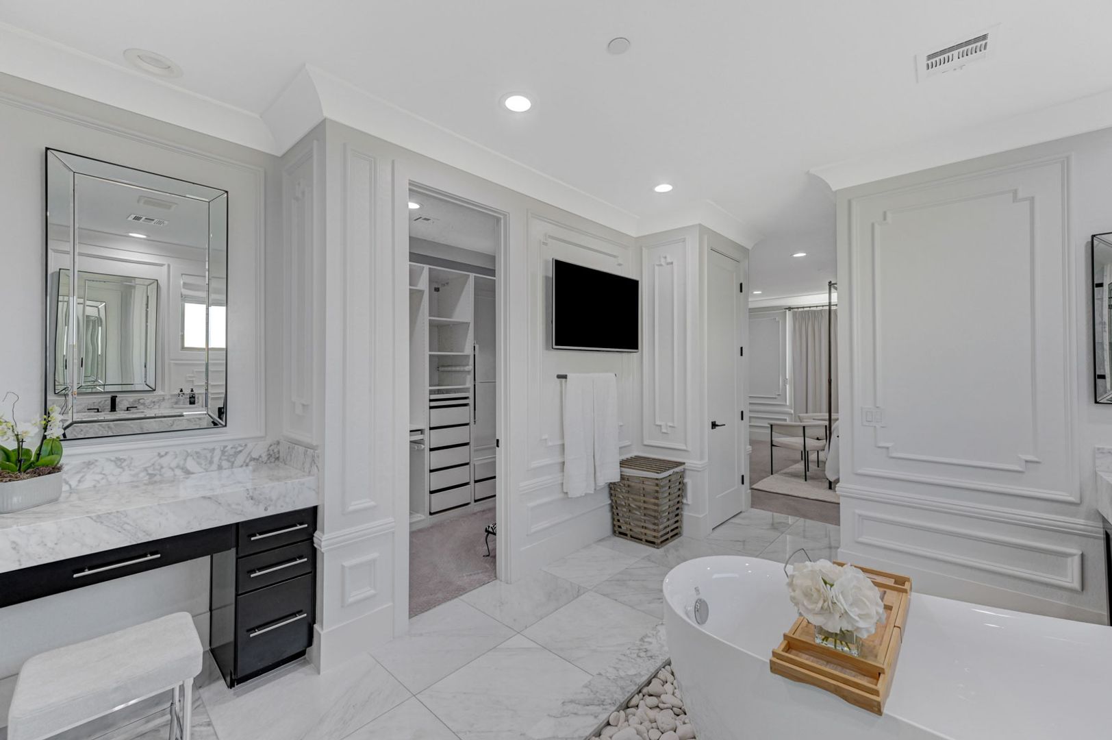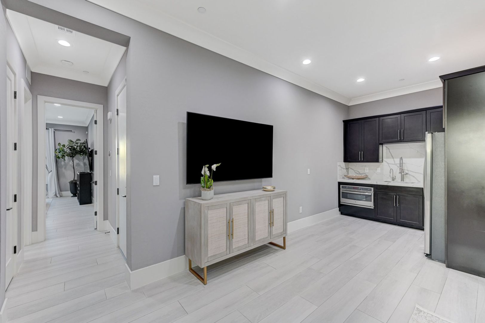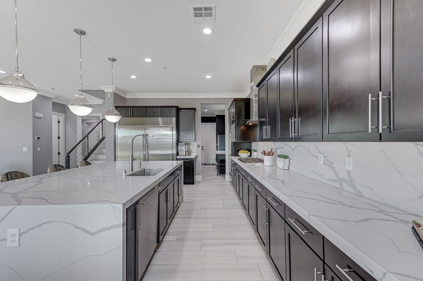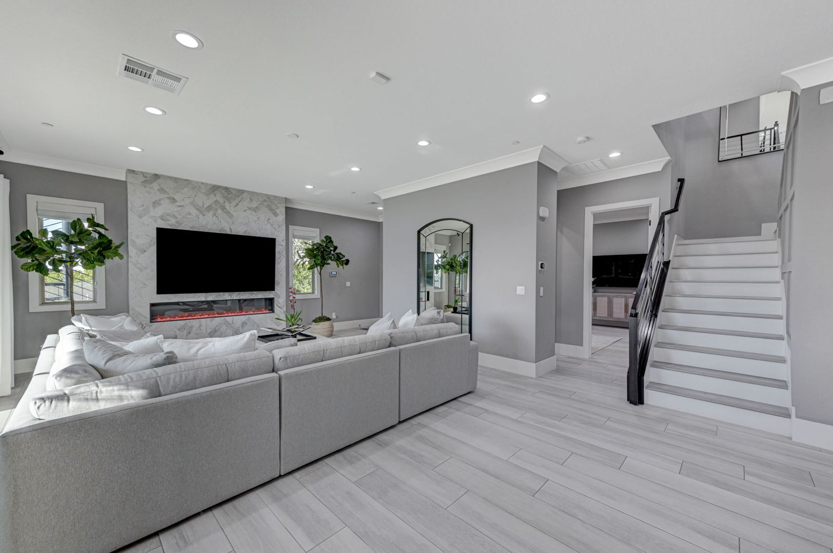 The open gourmet kitchen features top-tier stainless steel appliances, quartz countertops, dual wine refrigerators, and an oversized refrigerator/freezer—perfect for entertaining. The primary suite is a private retreat with a marble fireplace, balcony, Japanese soaking tub, spa-style marble shower with dual rain heads and body sprays, and custom dual closets.
