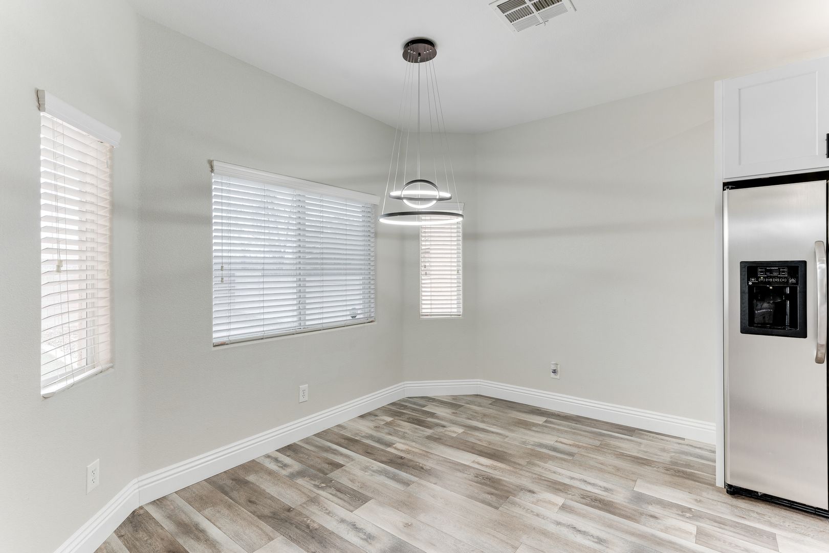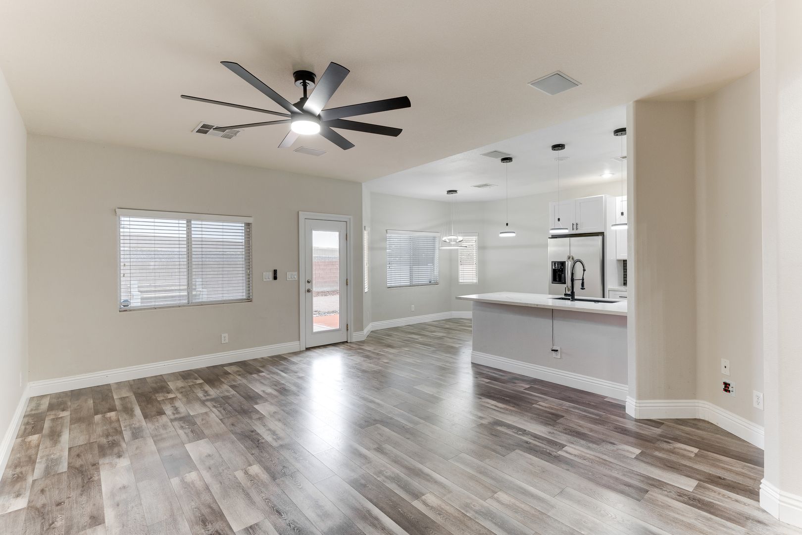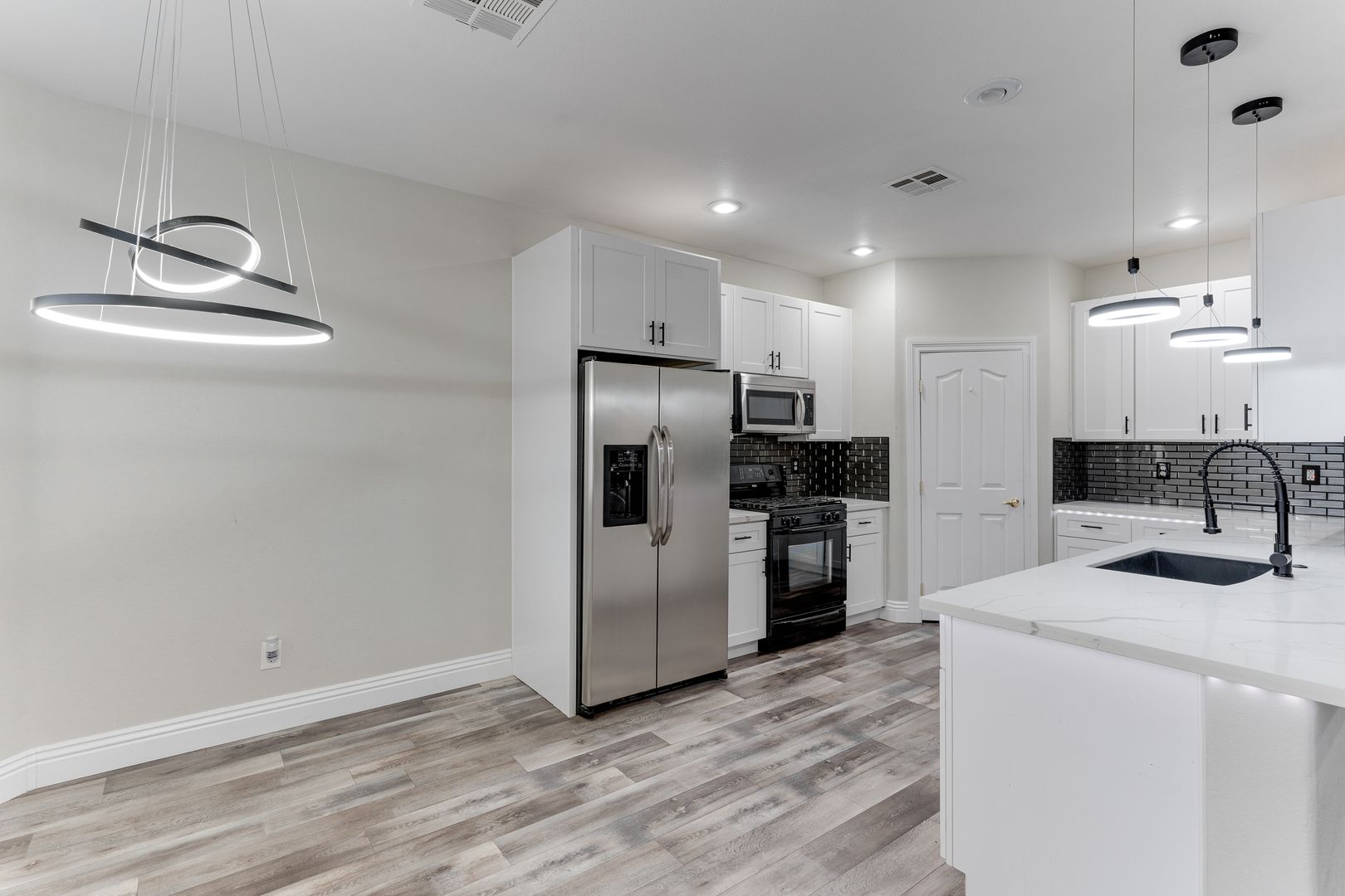 The kitchen is a showstopper with crisp white cabinetry, quartz countertops, subway tile backsplash, stainless steel appliances, and pendant lighting over a spacious island—ideal for gathering with family and friends.
