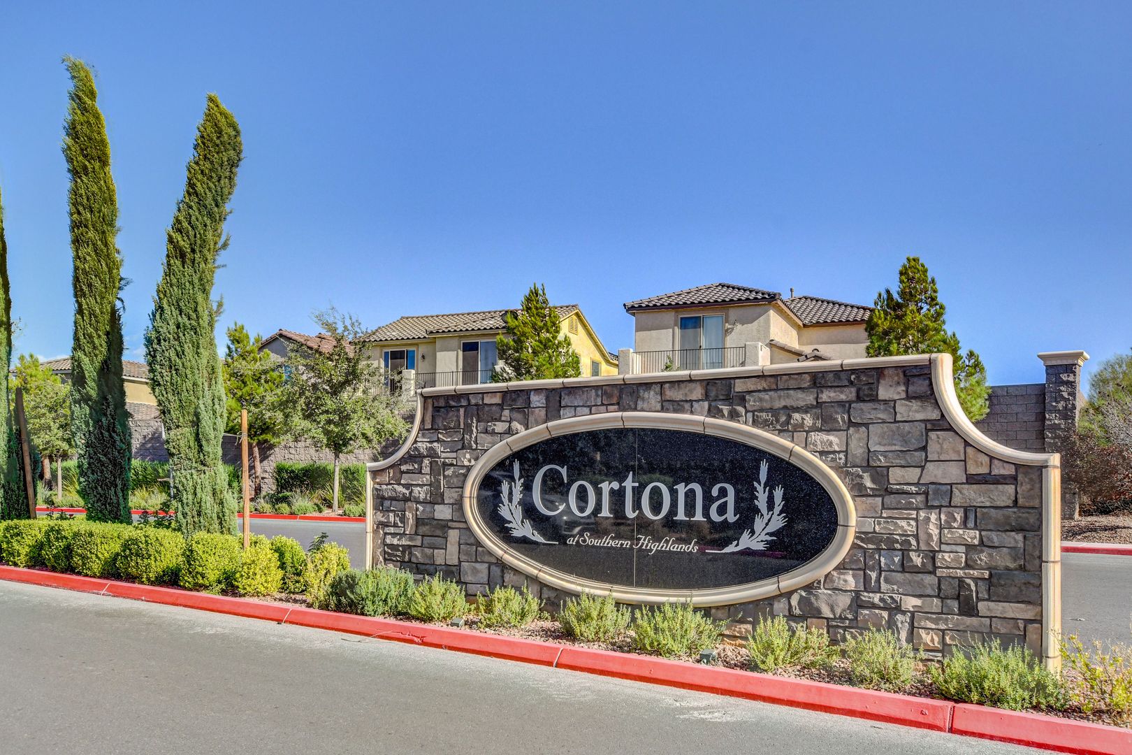 Located in the gated Cortona community of Southern Highlands, this charming two-story home features 3 bedrooms, 2.5 baths, and a 2-car garage with an upgraded outlet for an electric vehicle charging station. The backyard is perfect for entertaining with a putting green and brick pavers.