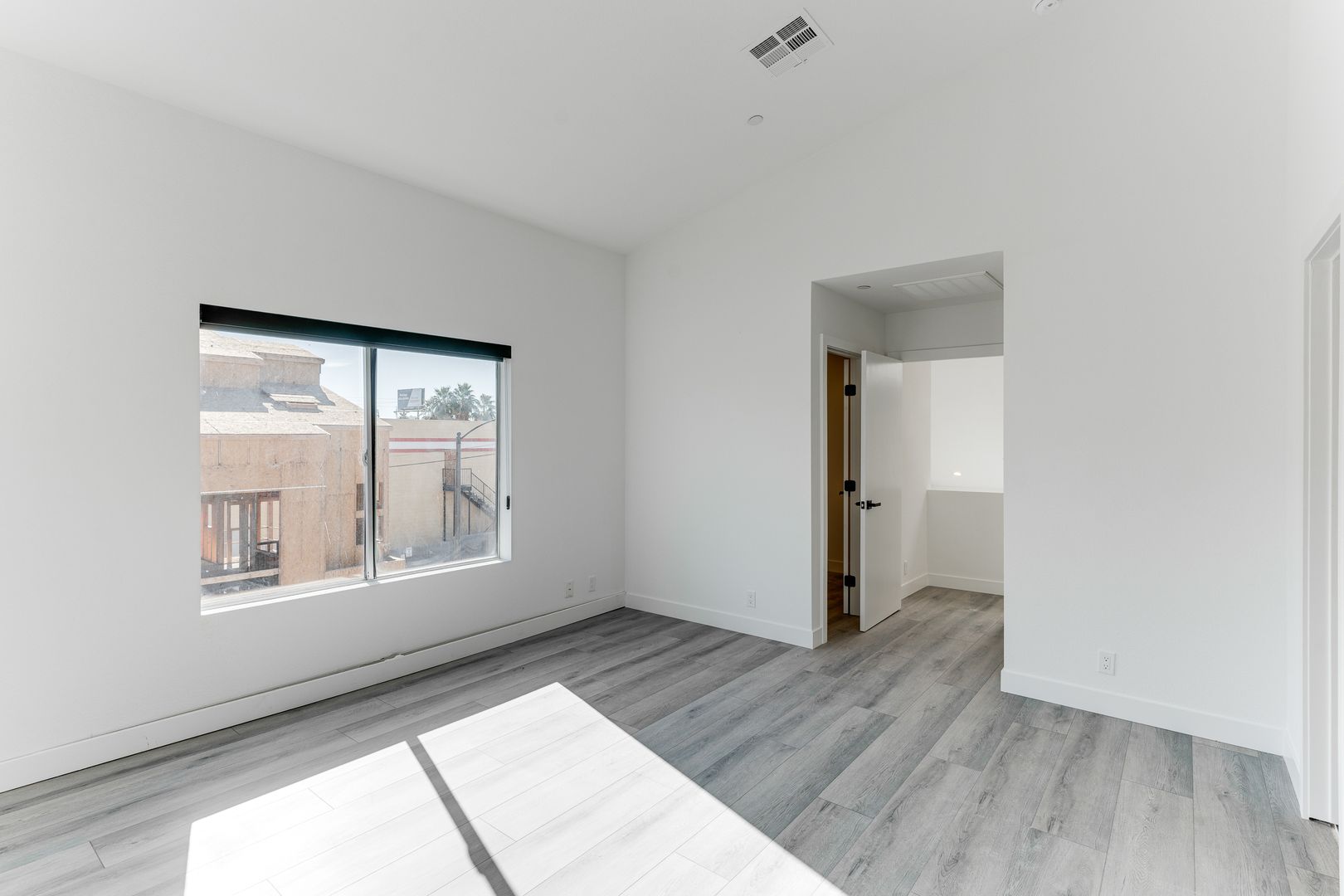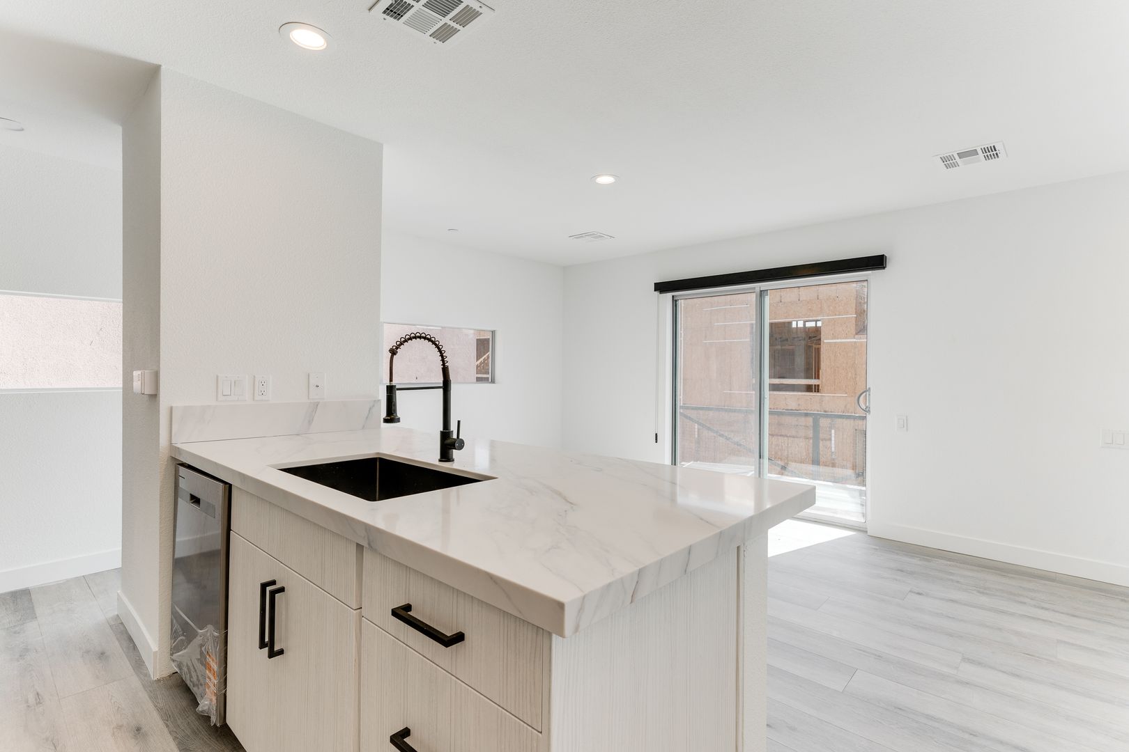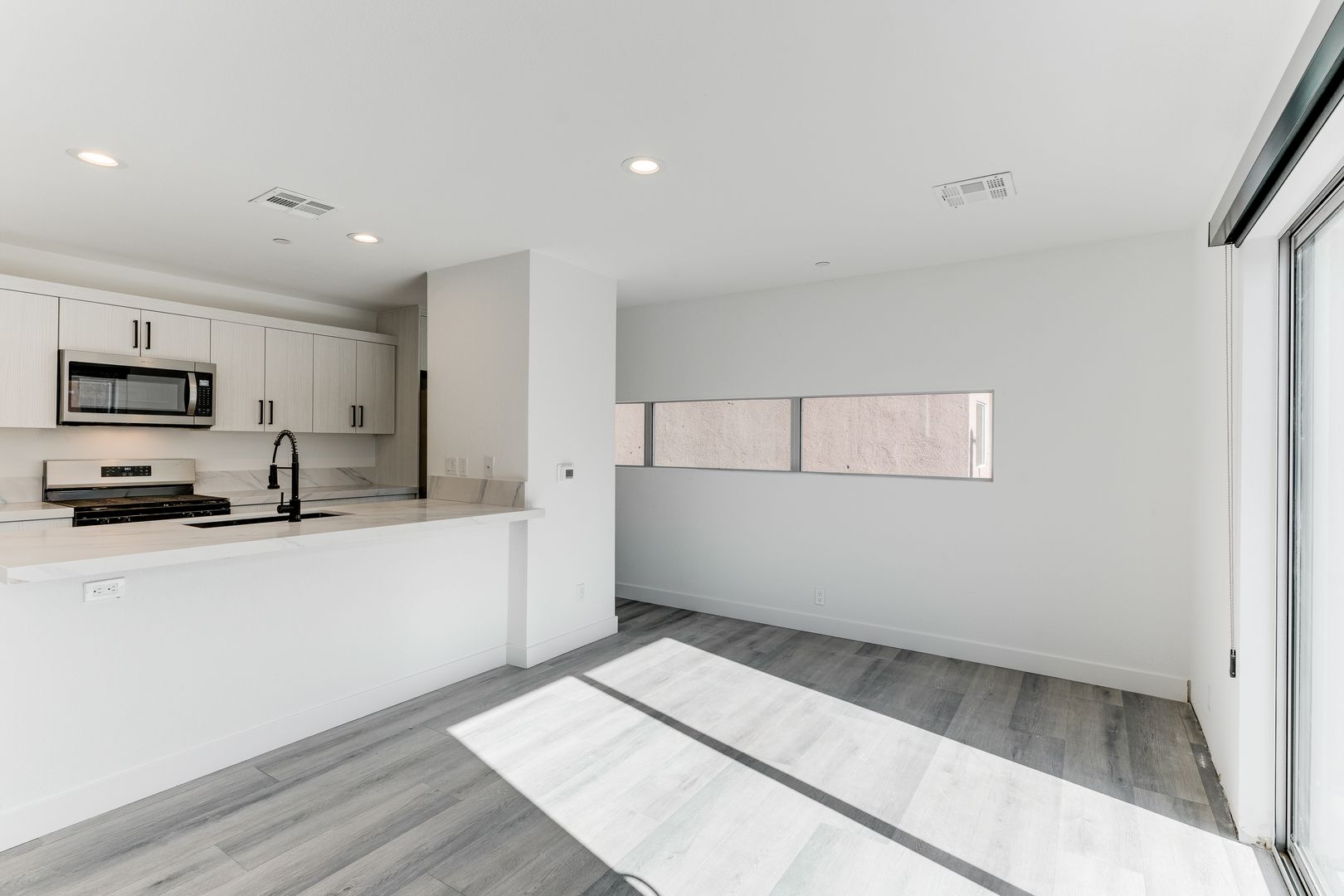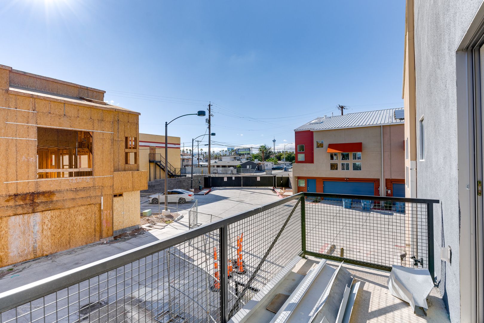 Discover this stunning loft-style townhome in the heart of Downtown! Spanning three levels, this home features a private yard, attached two-car garage, and modern design throughout. The first floor offers a bedroom, full bath, and versatile den with sleek concrete flooring. On the second floor, enjoy an open-concept kitchen, dining area, and living room with soaring vaulted ceilings, abundant natural light, and access to a private balcony. The top floor boasts a spacious primary suite with dual sinks and a large walk-in shower. Plus, take in breathtaking Strip and city views from both the second and third floors!