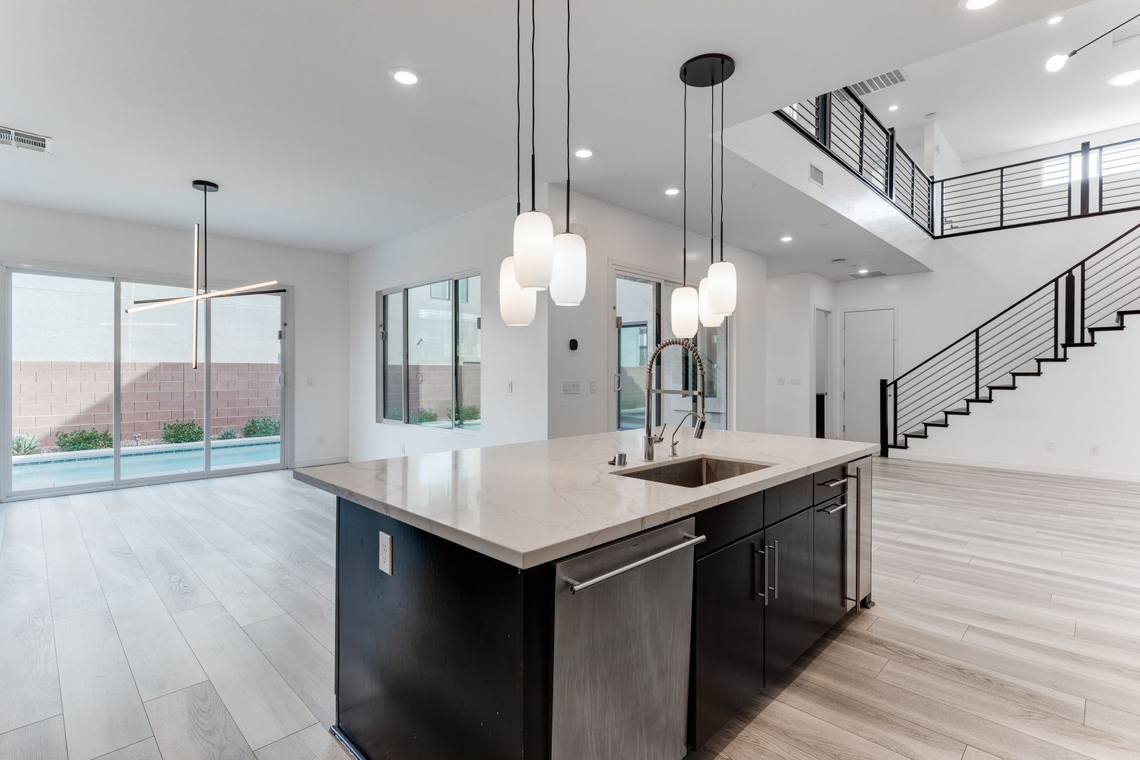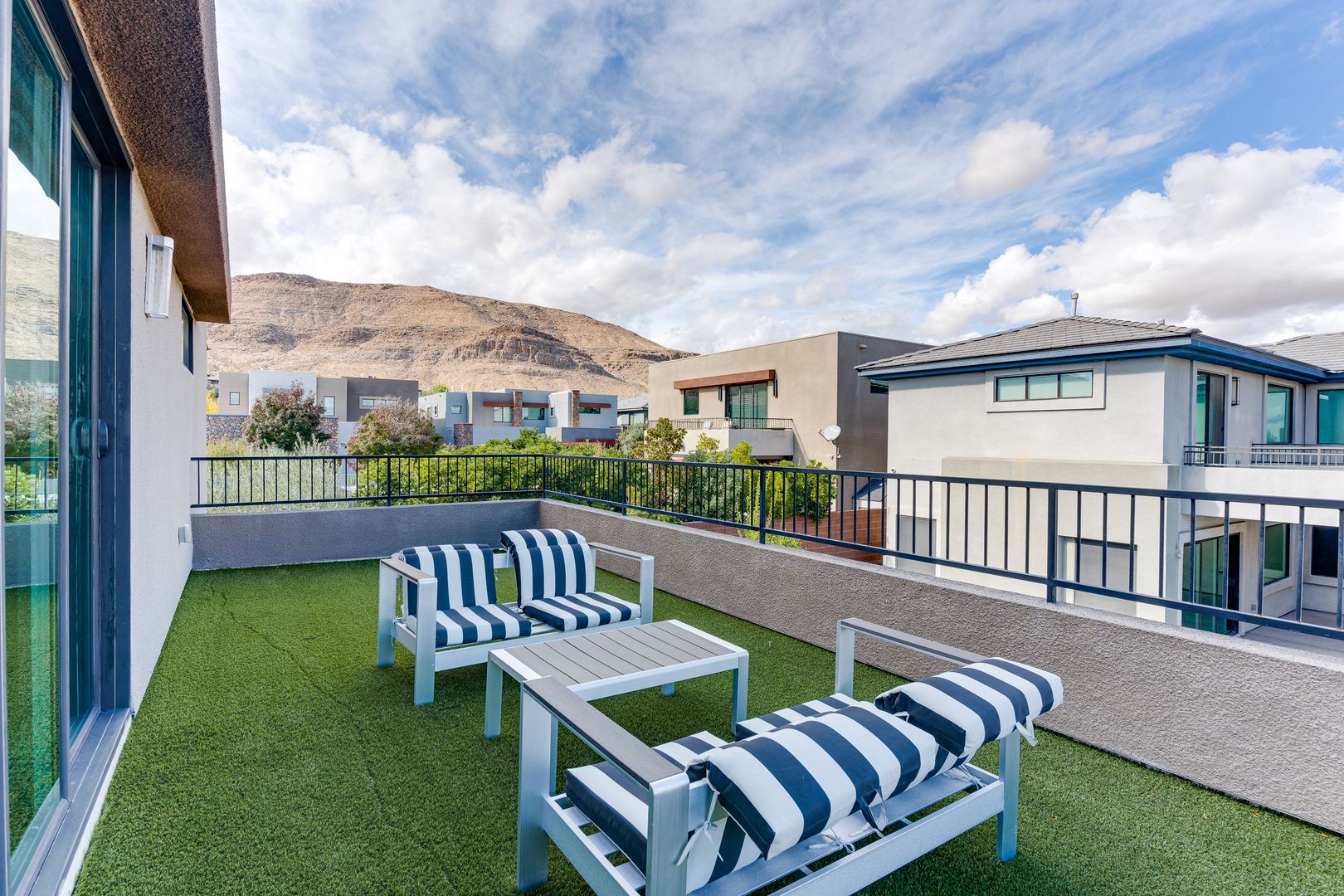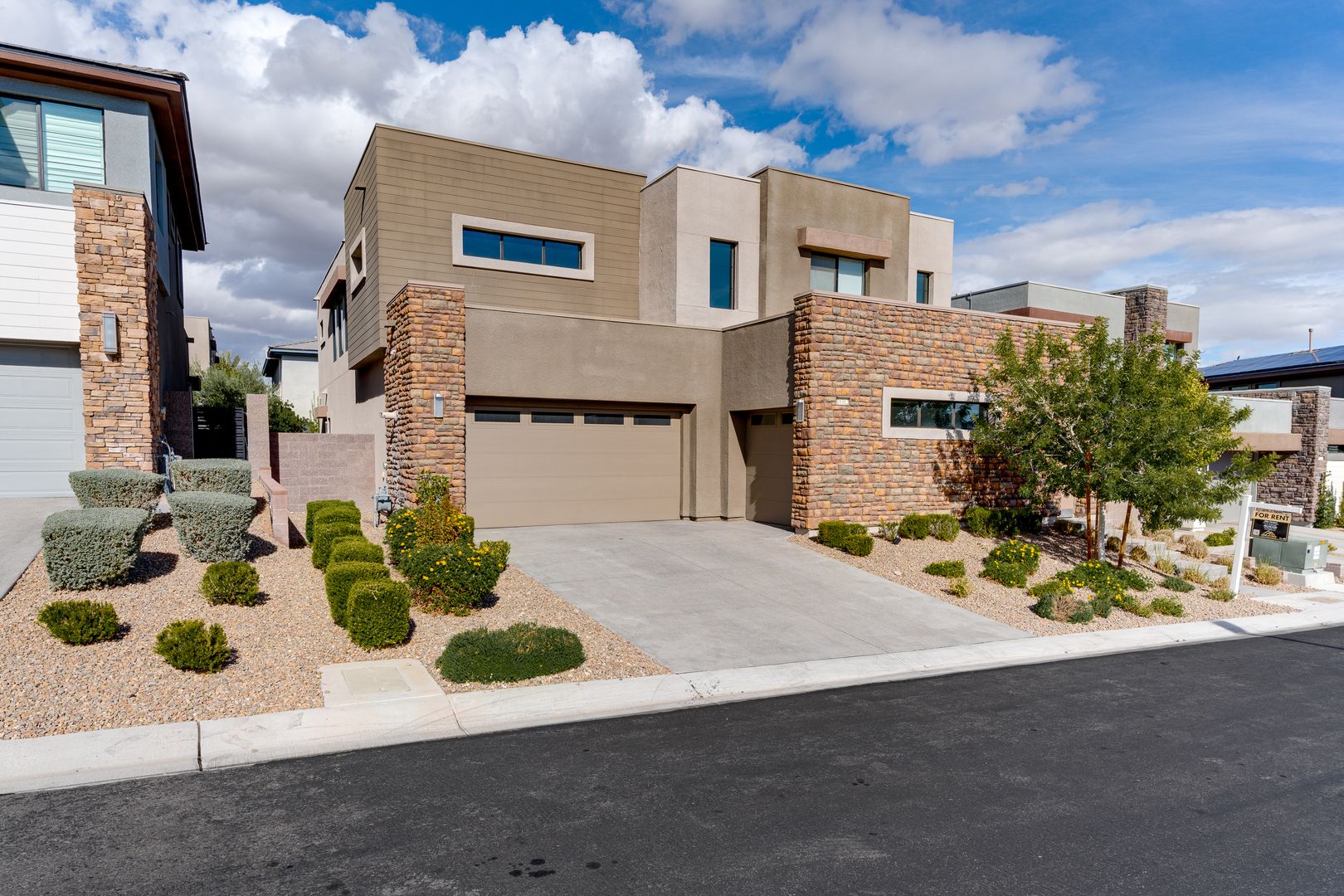 Nestled in the exclusive gated community of Oluna in South Summerlin, this stunning residence offers a perfect blend of modern design and serene desert beauty. Surrounded by scenic mountain views, green parks, and endless walking trails, the neighborhood is designed for both relaxation and recreation. Step inside to discover an airy open-concept layout with soaring ceilings and abundant natural light. The primary suite, conveniently located on the first floor, features direct access to the courtyard and sparkling pool. Upstairs, a spacious loft and generously sized bedrooms provide comfort and versatility, along with a balcony ideal for soaking in mountain vistas. Outdoor living is effortless with multiple spaces to entertain or unwind — from the private courtyard and covered patio to the expansive side yard with a luxurious pool and spa. This home is truly a retreat built for modern living.