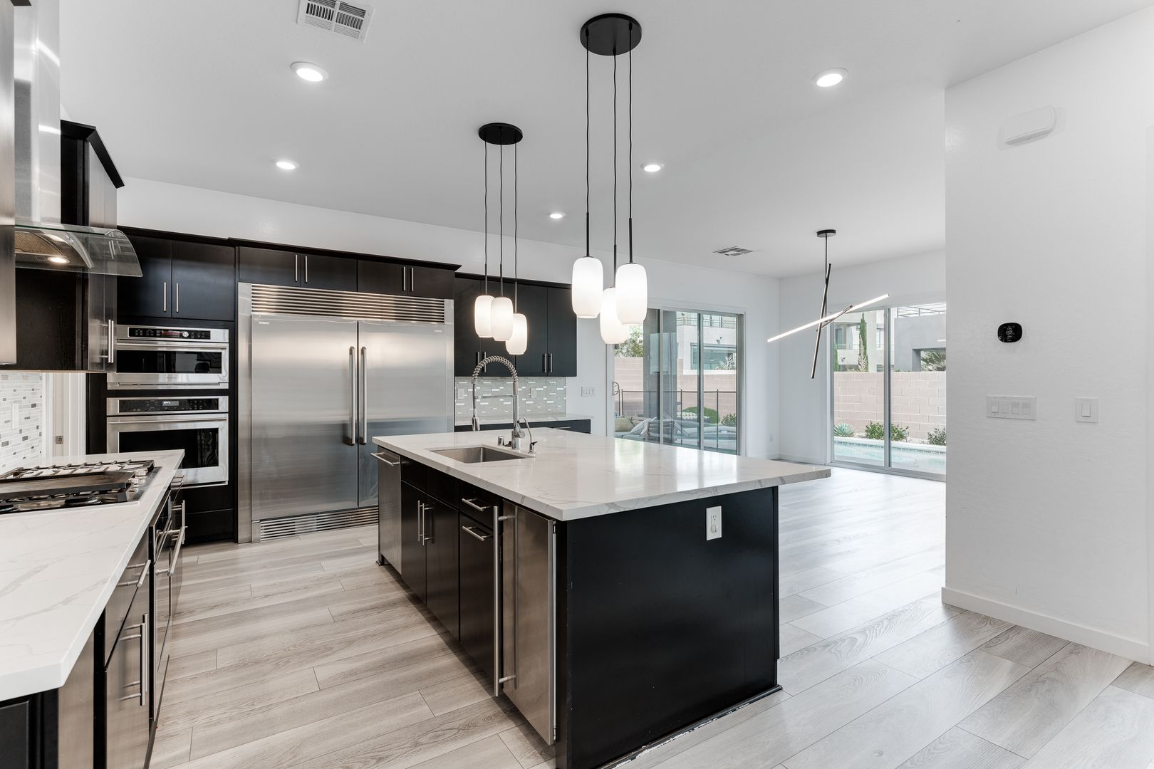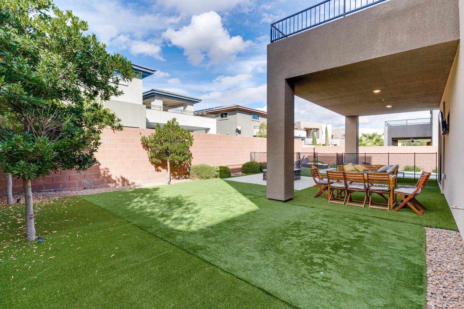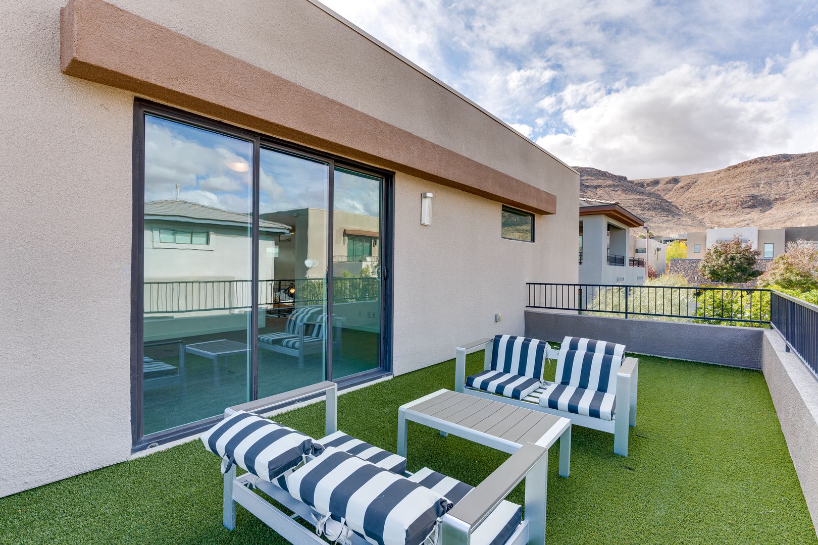 Nestled in the exclusive gated community of Oluna in South Summerlin, this stunning residence offers a perfect blend of modern design and serene desert beauty. Surrounded by scenic mountain views, green parks, and endless walking trails, the neighborhood is designed for both relaxation and recreation. Step inside to discover an airy open-concept layout with soaring ceilings and abundant natural light. The primary suite, conveniently located on the first floor, features direct access to the courtyard and sparkling pool. Upstairs, a spacious loft and generously sized bedrooms provide comfort and versatility, along with a balcony ideal for soaking in mountain vistas. Outdoor living is effortless with multiple spaces to entertain or unwind — from the private courtyard and covered patio to the expansive side yard with a luxurious pool and spa. This home is truly a retreat built for modern living.