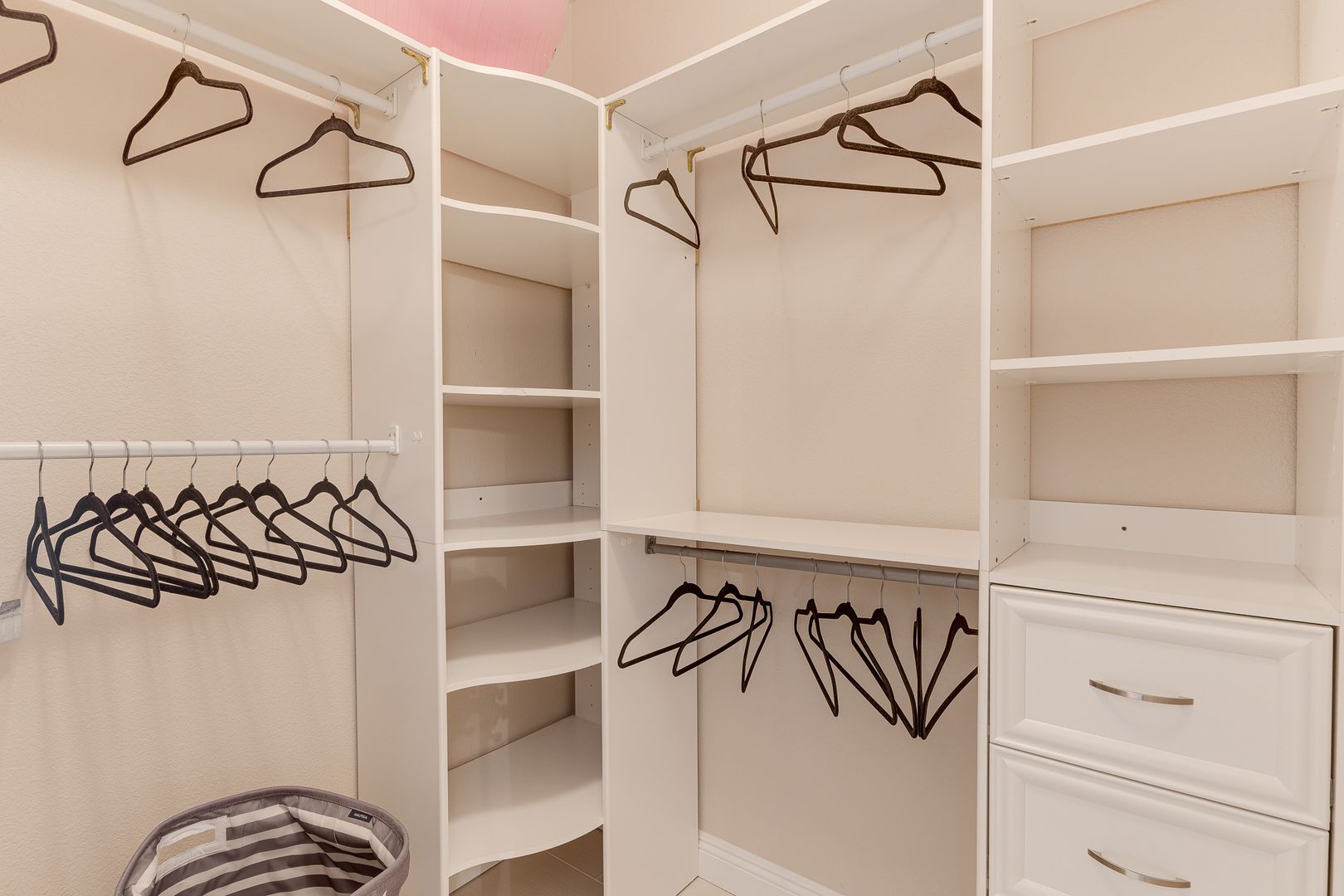 Relax in the primary suite with a walk-in closet, separate tub and shower, and a soothing jetted tub.