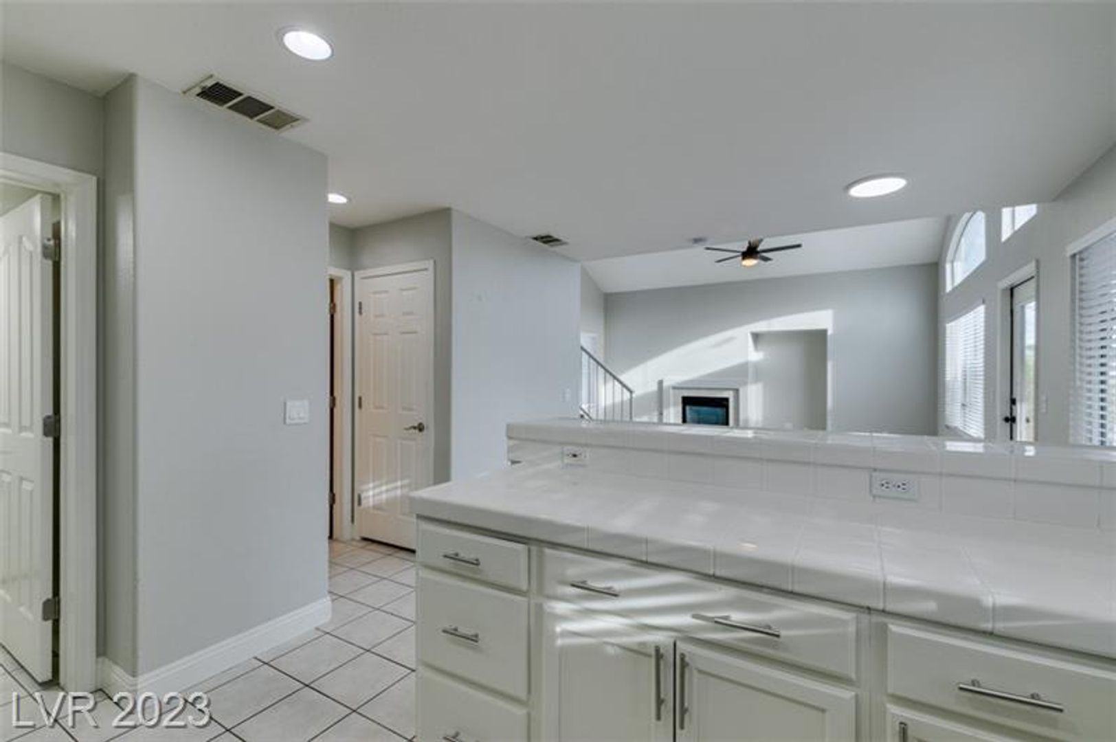Welcome to this stunning two-story, three-bedroom, 2.5-bathroom home in the heart of Summerlin! The spacious living room flows seamlessly into the dining area and open kitchen, featuring a breakfast bar, tile countertops, a pantry, and stainless steel appliances—plus plenty of cabinet and counter space. Upstairs, the primary suite boasts a walk-in closet and double sinks. Outside, enjoy a beautifully maintained backyard with a sparkling pool, relaxing spa, and lush landscaping. With tile and wood flooring throughout and numerous upgrades, this home is move-in ready and waiting for you!