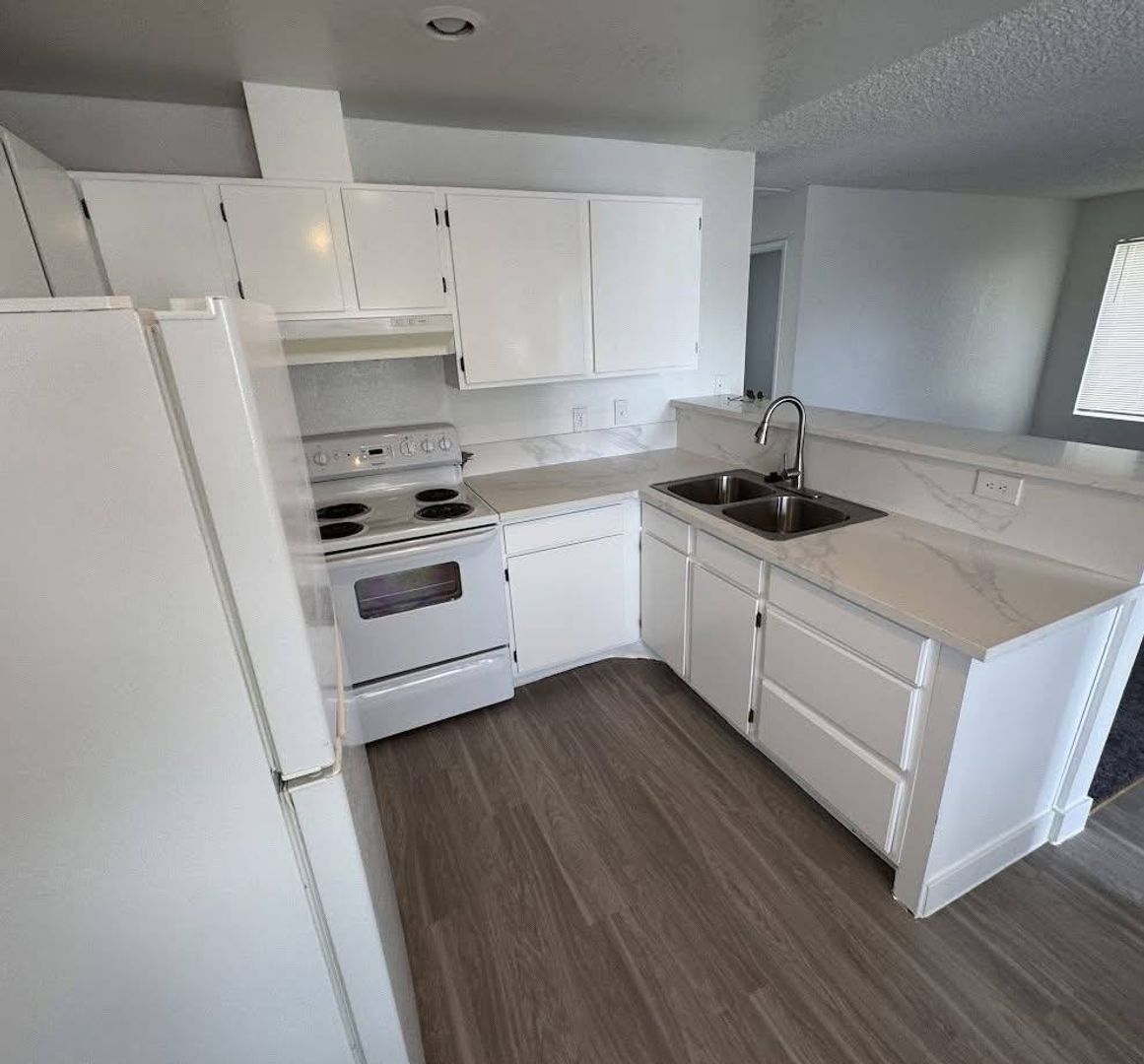Fresh flooring throughout adds a modern touch, enhancing the home’s clean and spacious feel. Both bedrooms offer plenty of room to relax, while the newly upgraded bathroom showcases a sleek marble shower, creating a spa-like experience right at home.