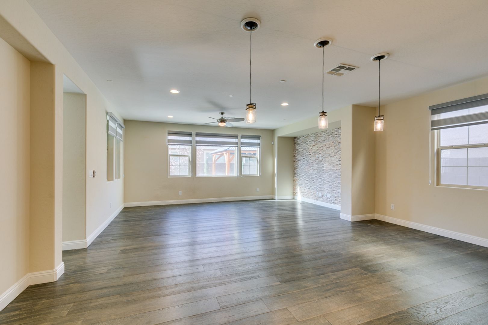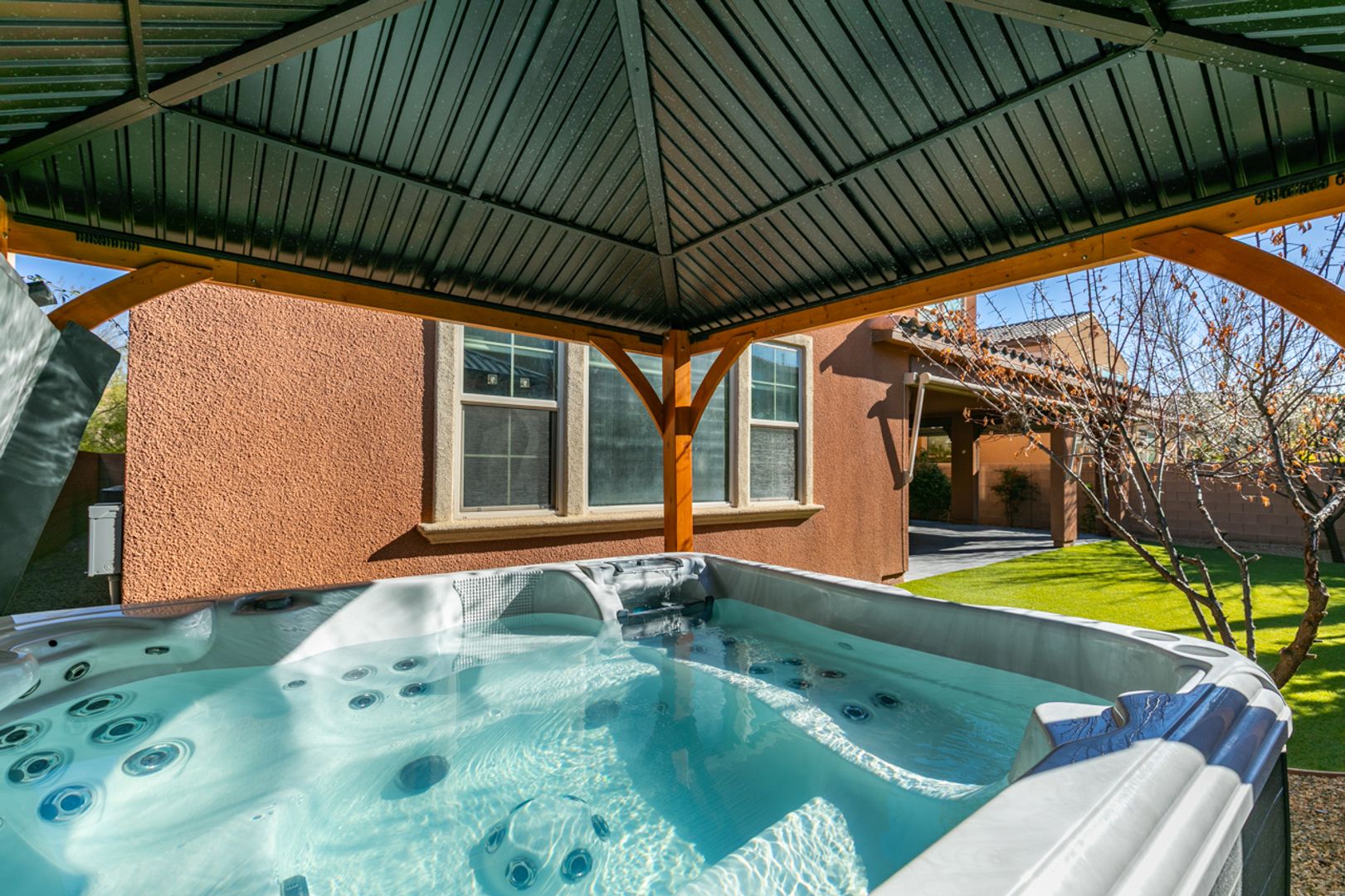 Located on a quiet cul-de-sac within a gated Inspirada community, this spacious and inviting home offers a bright, open floor plan designed for comfortable living. Dual sliding glass doors create seamless indoor-outdoor flow to a wrap-around patio with drop shades, gazebo, and jetted hot tub, perfect for relaxing or entertaining. The oversized kitchen features stainless steel appliances, granite countertops, ample cabinetry, and a breakfast bar, opening to a great room with a cozy gas fireplace and adjacent dining area. The private primary suite is separated from the secondary bedrooms and includes a large walk-in closet and an ensuite bath with dual vanities, a soaking tub, and a glass-enclosed shower. Low-maintenance landscaping, an EV charger in the garage, and access to Inspirada’s community amenities complete this well-appointed home.