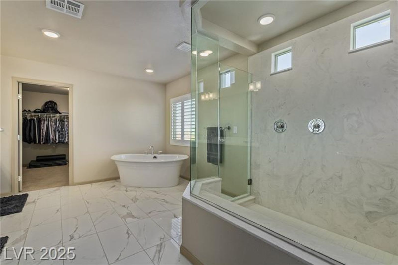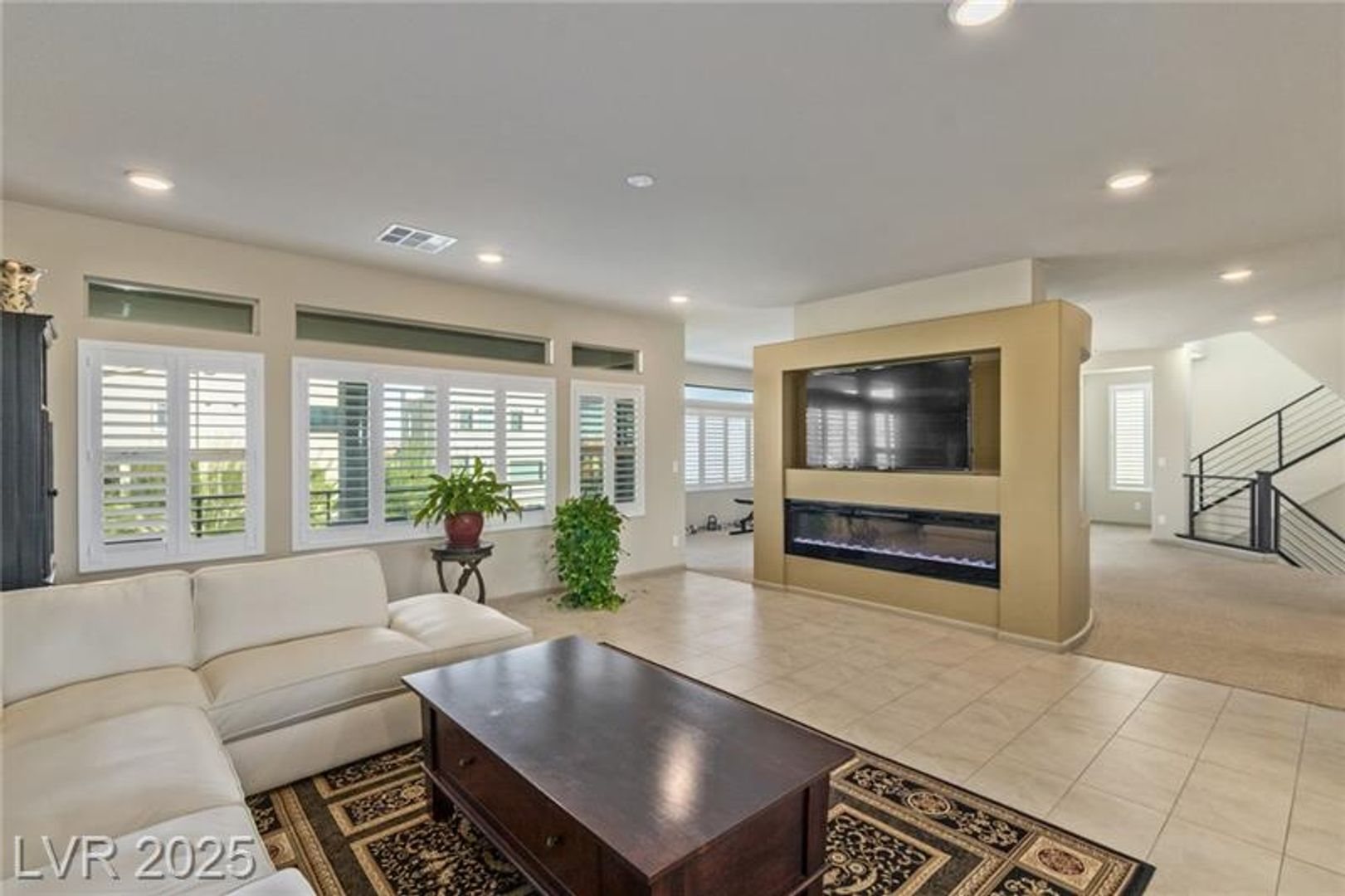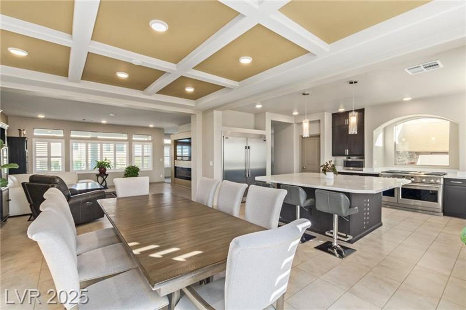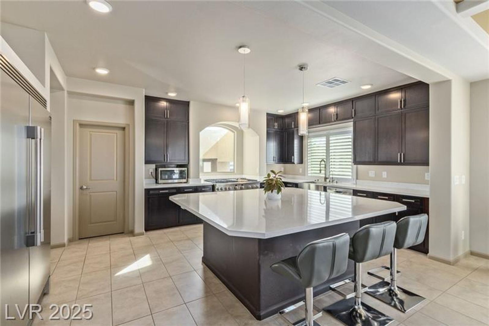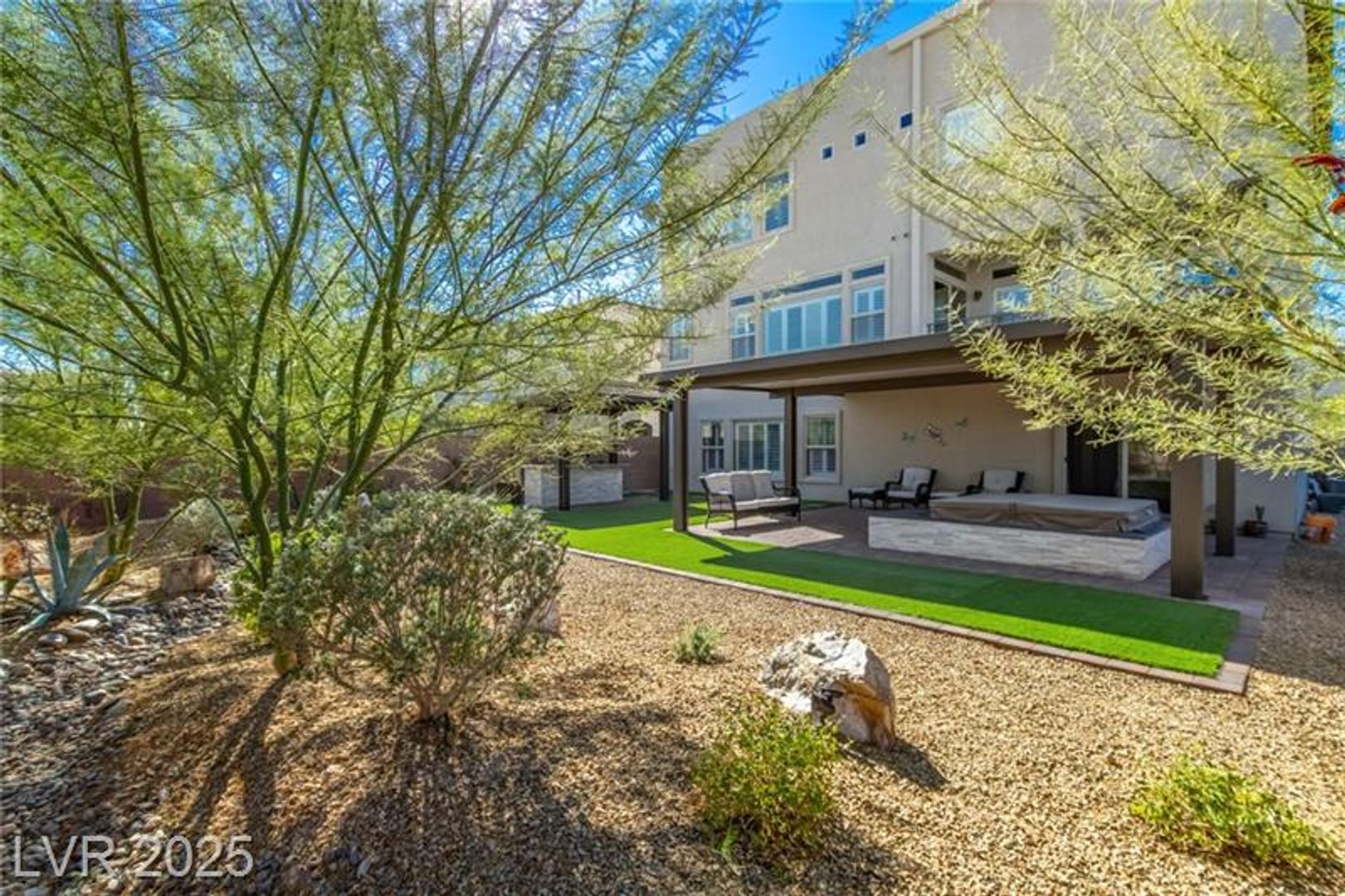 Experience elevated living in this modern tri-level masterpiece, featuring dual primary suites, captivating curb appeal, and a rooftop deck with panoramic views. Tucked at the end of a quiet cul-de-sac, a stone driveway leads to a spacious 3-car garage. Enter the vermillion front door into a beautifully finished interior filled with natural light and designer touches. The first level offers a cozy family room, a serene primary suite with en suite bath, and direct access to the backyard's above-ground spa. The second floor features a bright open living area and versatile room opening to a sunny balcony. The elegant dining room, with a two-tone tray ceiling, flows into a chef's kitchen with premium stainless steel appliances, farmhouse sink, white marble counters, mocha cabinetry, and a large island under pendant lights. The top level hosts a second luxe primary suite with walk-in shower and freestanding tub. The oversized backyard has turf, a stone river, grill, and dual pergolas.